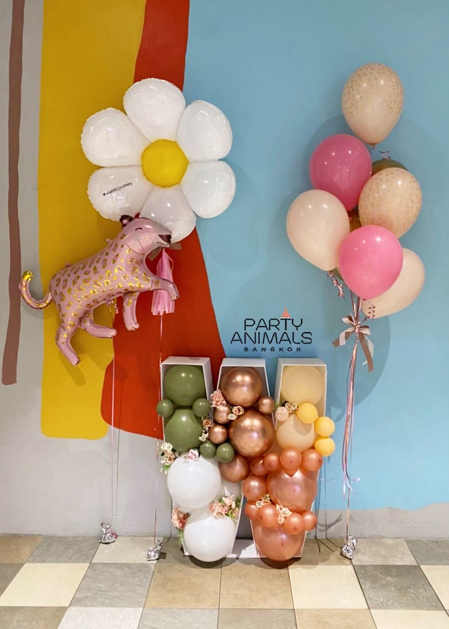 ลูกโป่งวันเกิด ลูกโป่งเซอร์ไพรส์ Birthday Balloon – Eucalyptus Green & Rose Gold Mosaic Balloon with Tiger Pink and Daisy Flower Bouquets (Air-filled & with helium) (11 pcs)