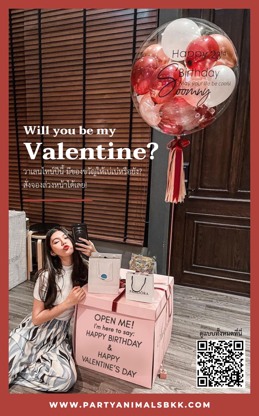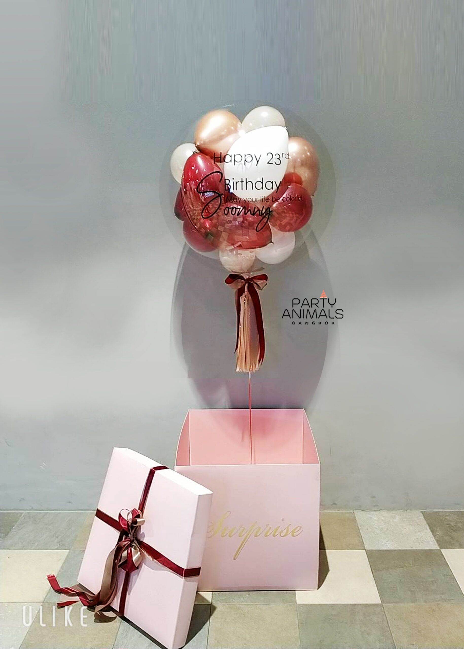 ลูกโป่งวันเกิด ลูกโป่งเซอร์ไพรส์ Birthday Balloon – Burgundy Red Wine & Rose Gold Tiny in Big Balloon Valentine in Surprise Box (with helium)