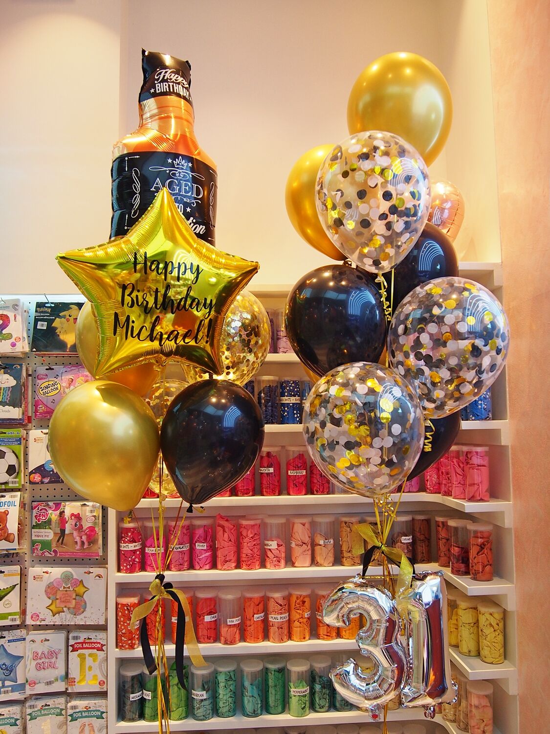 ลูกโป่งวันเกิด ลูกโป่งเซอร์ไพรส์ Birthday Balloon – Black & Gold 31st Whisky Bottle Balloon Bouquet (with helium) (17 pcs)