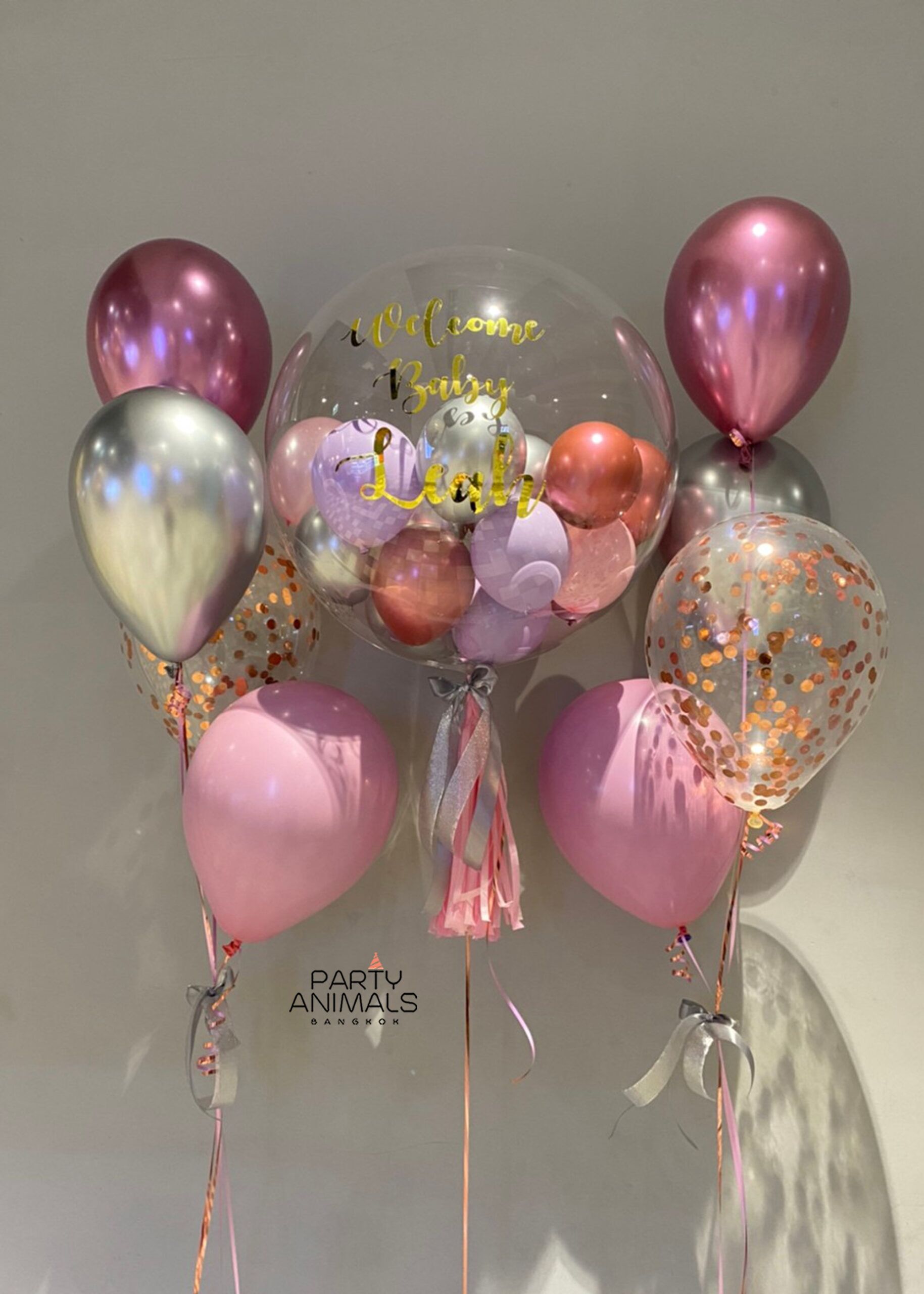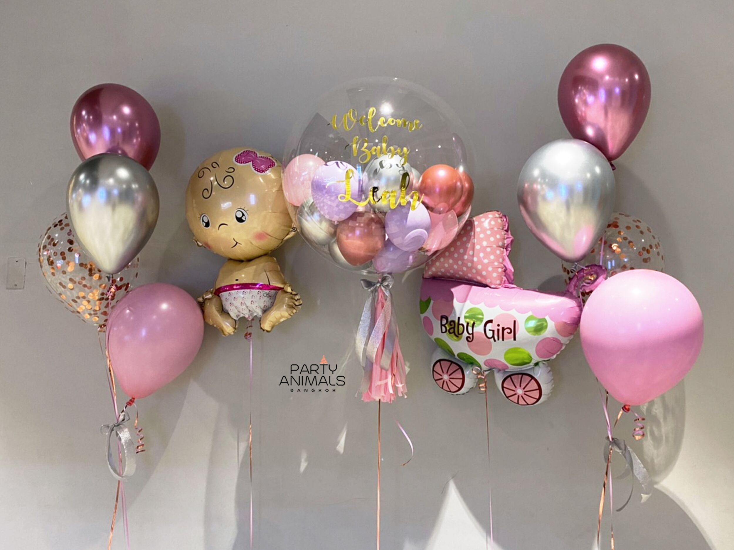 ลูกโป่งเยี่ยมคลอด ลูกโป่งต้อนรับทารก Welcome Baby Balloons (Baby Girl) – STROLLER & Tiny in Big Mauve Pink Balloon Set (with helium) (11 pcs)