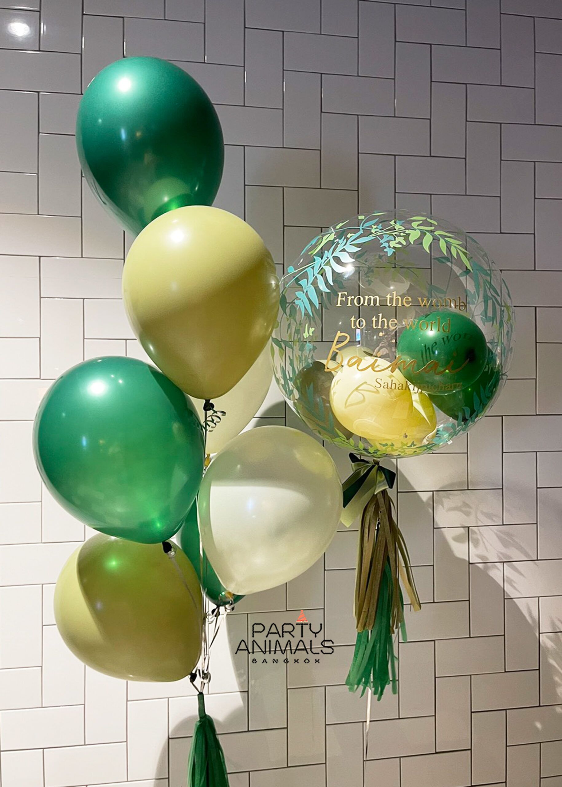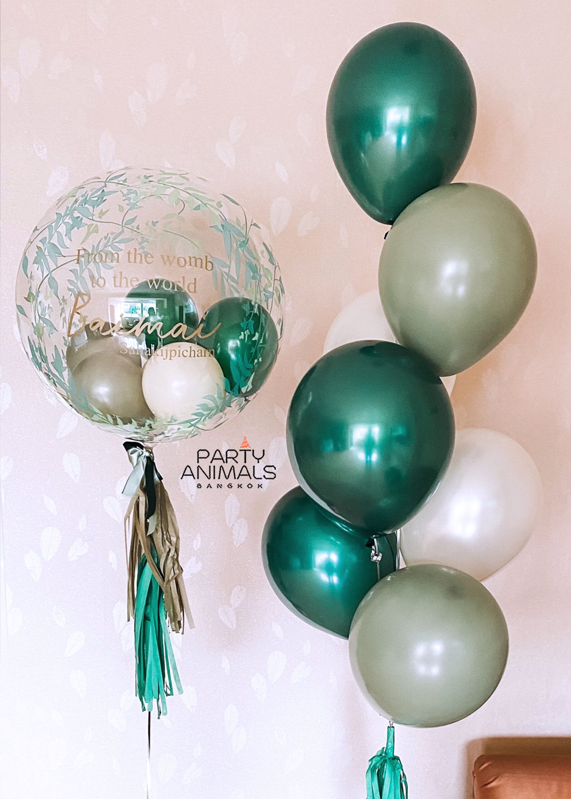 ลูกโป่งเยี่ยมคลอด ลูกโป่งต้อนรับทารก Welcome Baby Balloons (Baby Boy) – Greenery Leaves Bubble with Tiny Balloons with Green Bouquet (with Helium) (8 pcs)