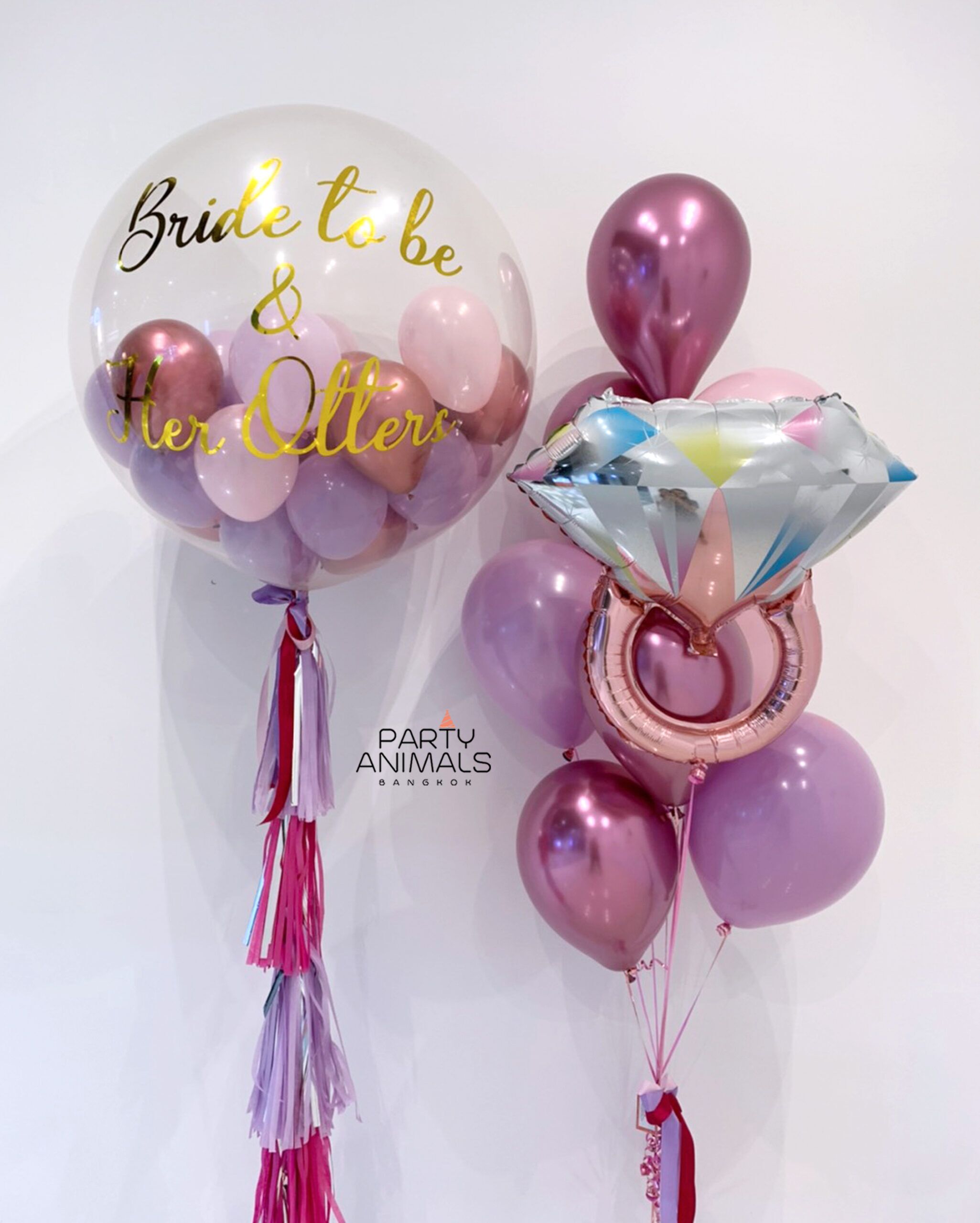 ลูกโป่งปาร์ตี้สละโสด ลูกโป่งเฮนไนท์ Hen Party Balloon – BRIDE TO BE Tiny in 36″ Big Balloons Diamond Ring Mauve Pink Purple & Gold Balloon Set (with Helium) (11 pcs)
