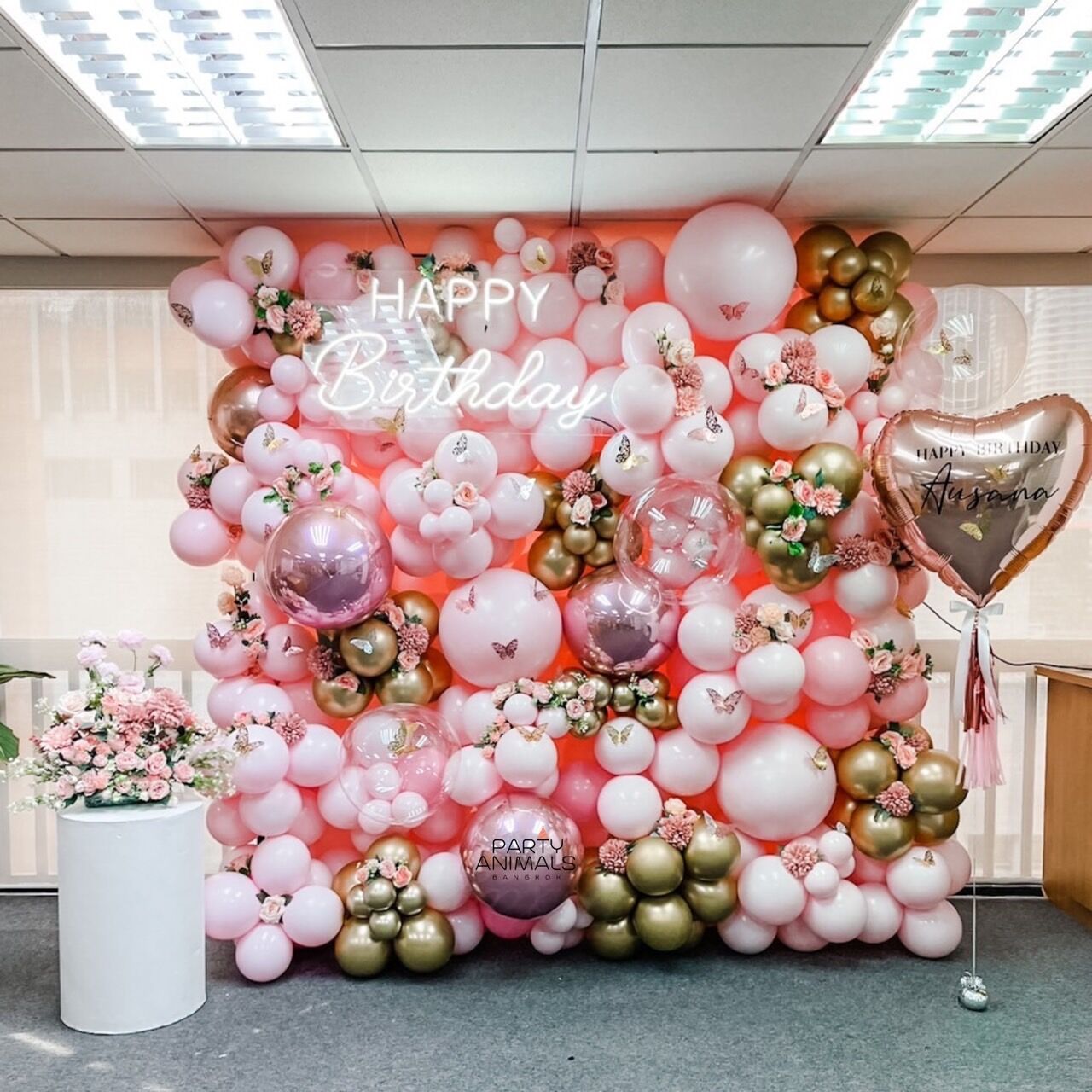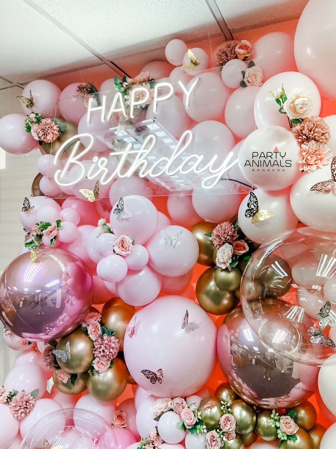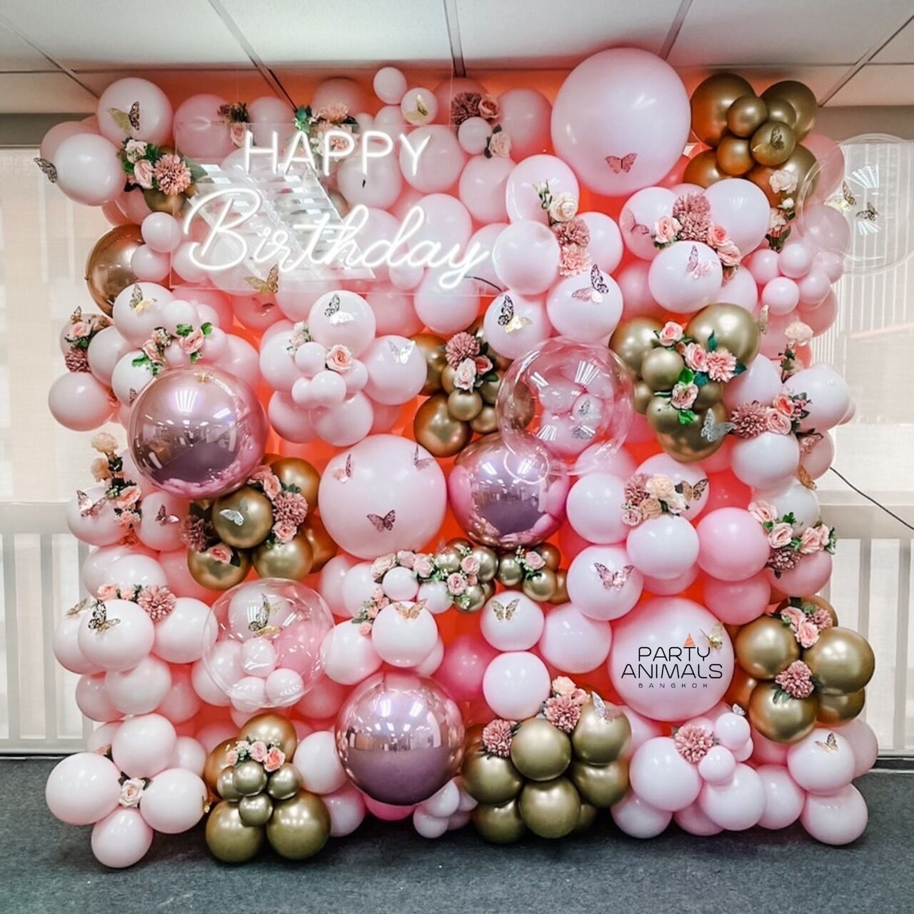 แบคดรอปลูกโป่ง ฉากลูกโป่ง Birthday Balloon Backdrop – Floral Party – Pink & Rose Gold
