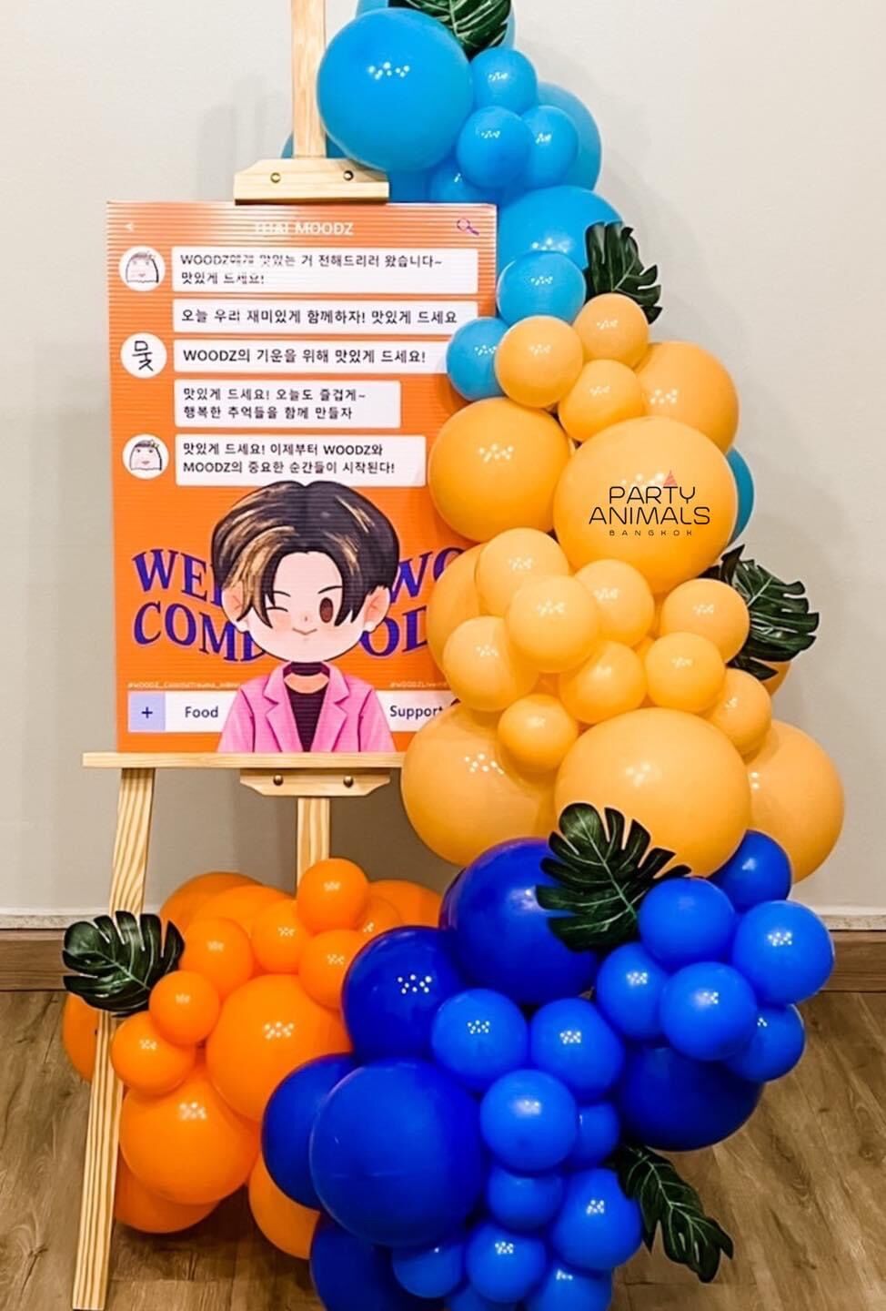 แบคดรอปลูกโป่ง ฉากลูกโป่ง Fan Meeting Balloon Backdrop – WOODZ Korean Singer Easel Stand – Orange & Blue