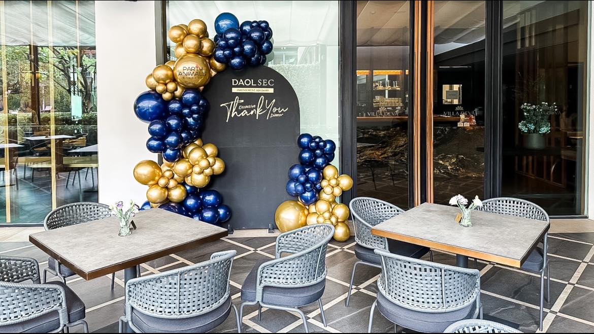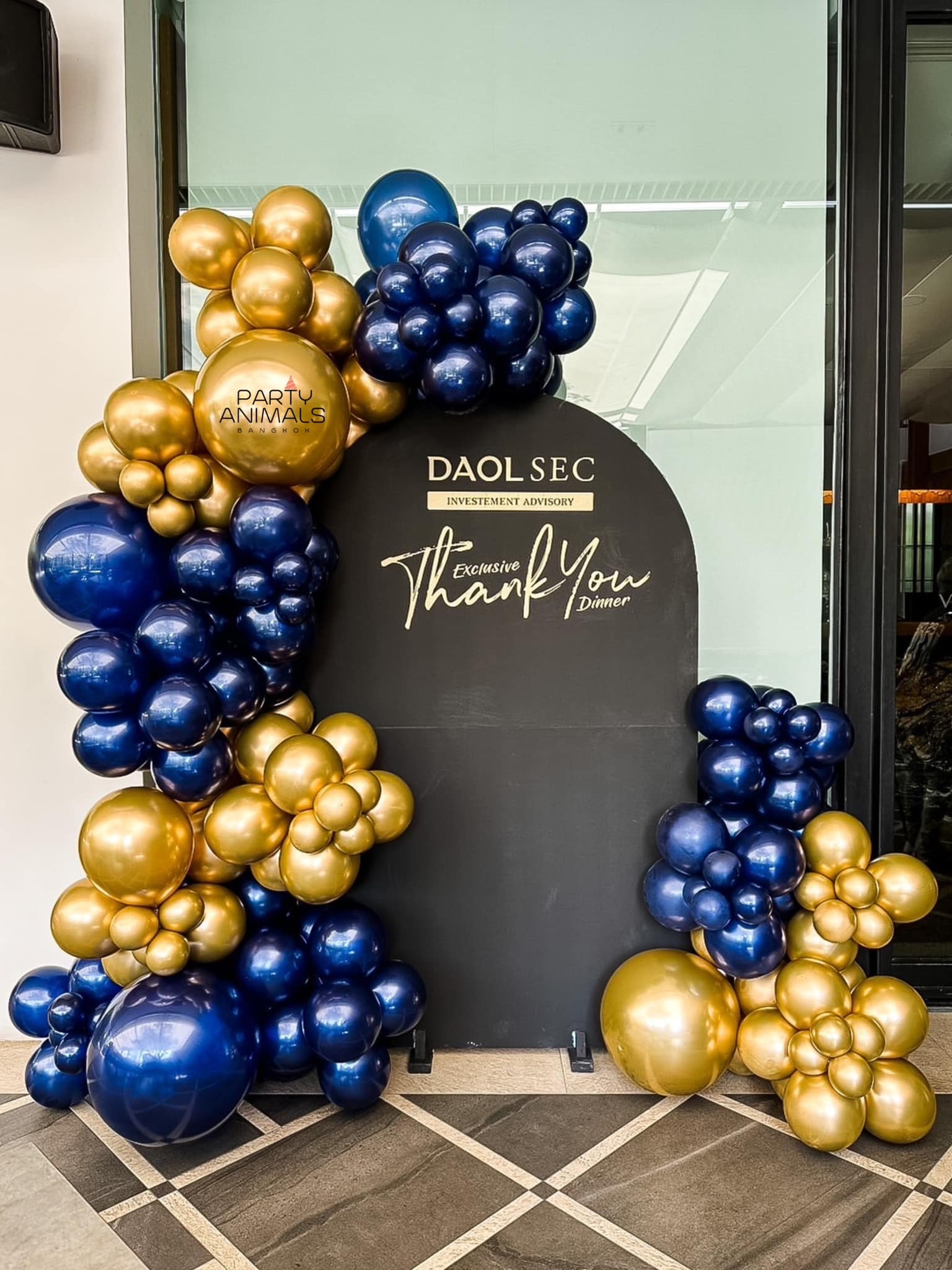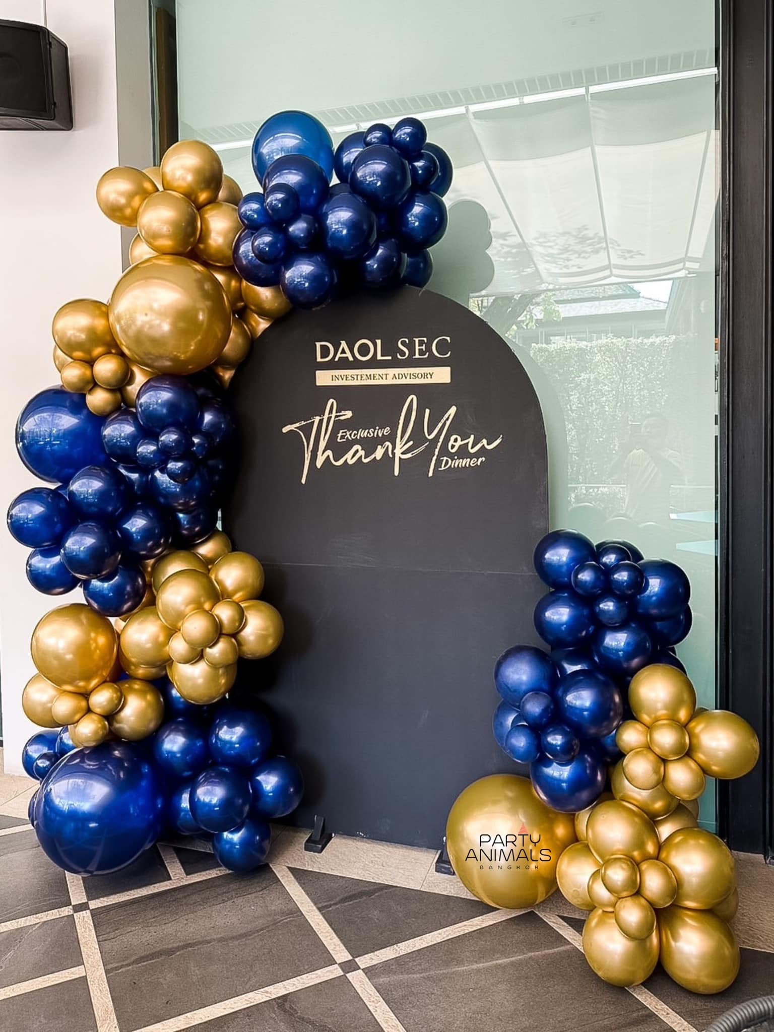 แบคดรอปลูกโป่ง ฉากลูกโป่ง Corporate Events Balloon Backdrop – Exclusive thank you Dinner Party – Navy & Gold