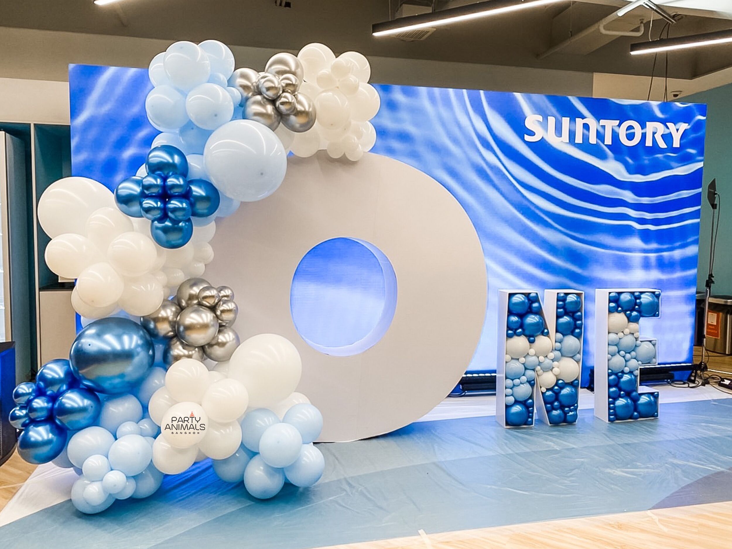 แบคดรอปลูกโป่ง ฉากลูกโป่ง Corporate Events Balloon Backdrop – Royal Blue & Silver and Mosaic Balloon