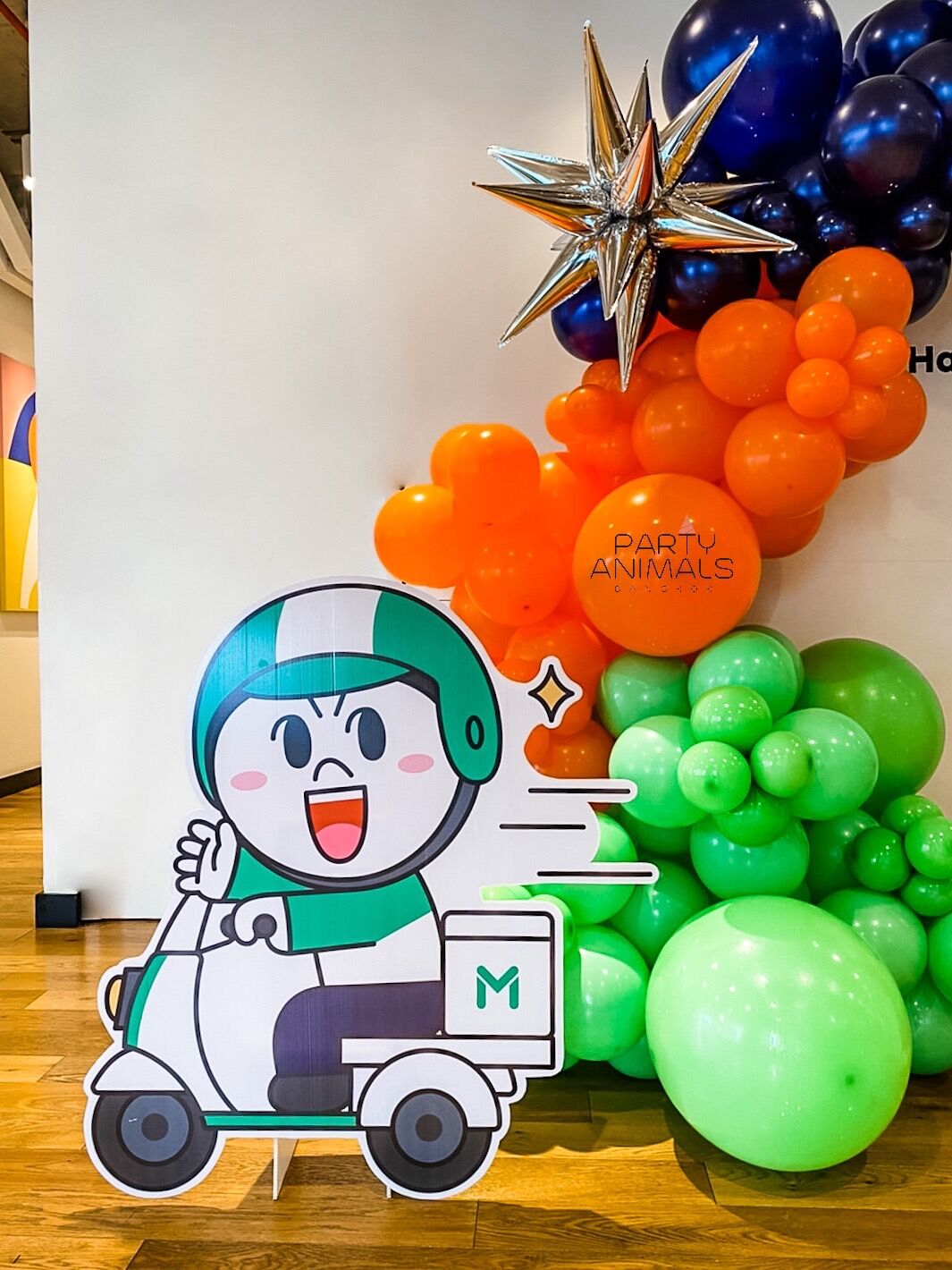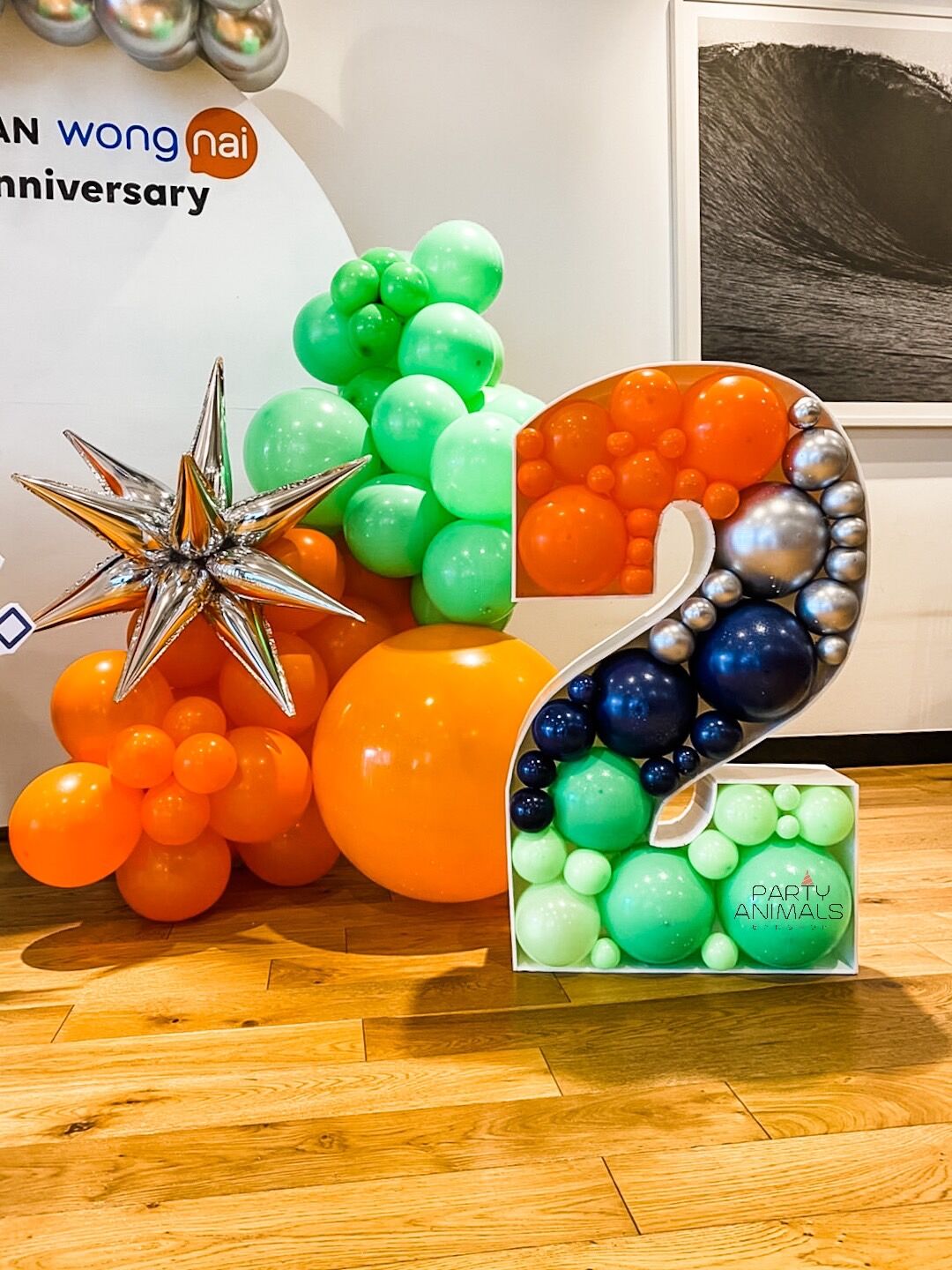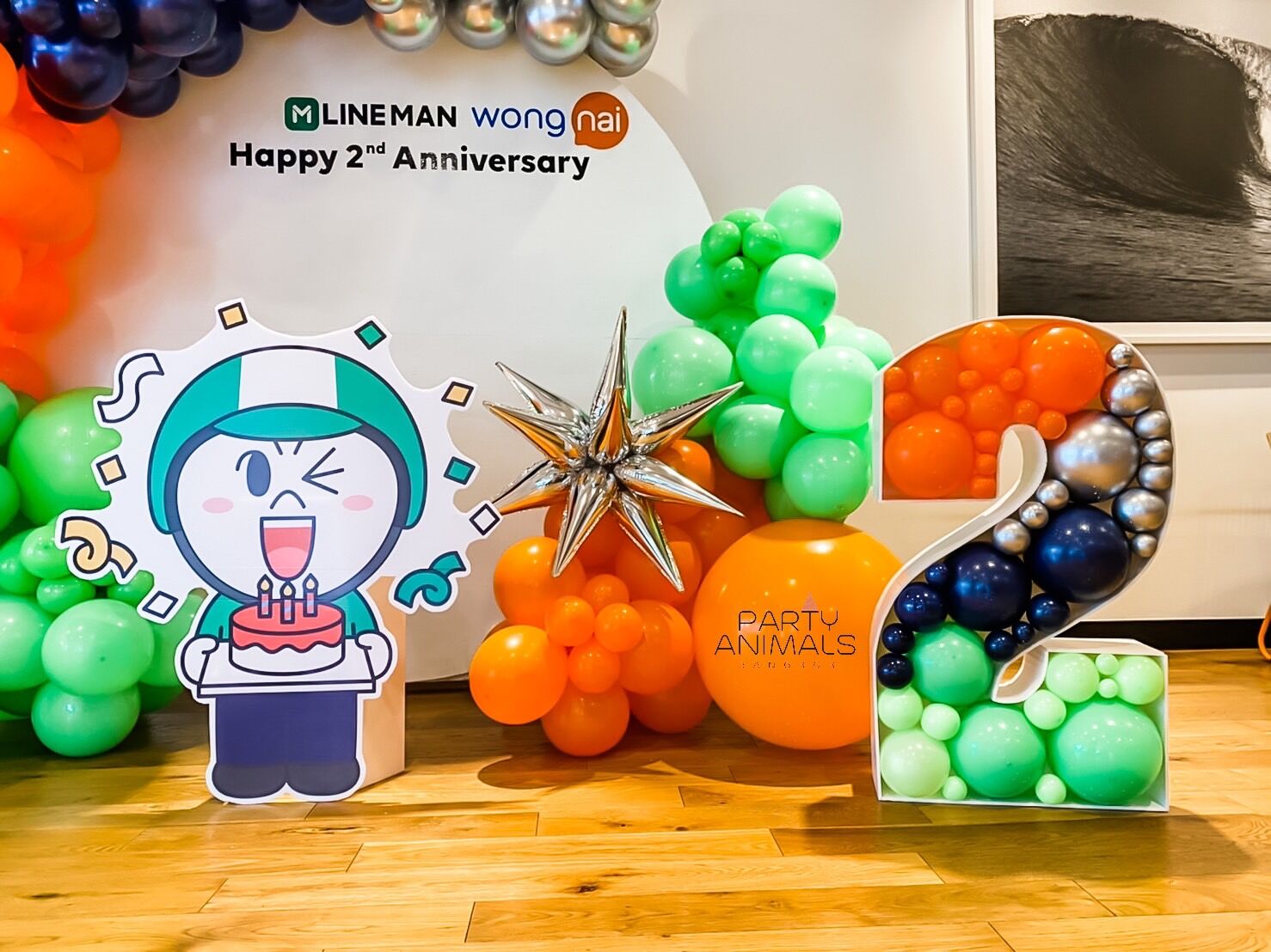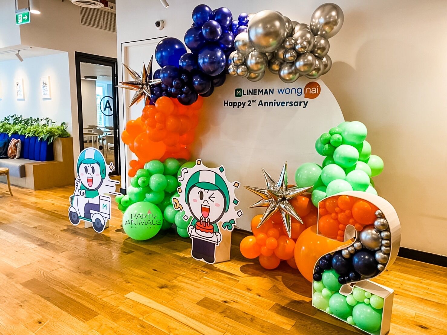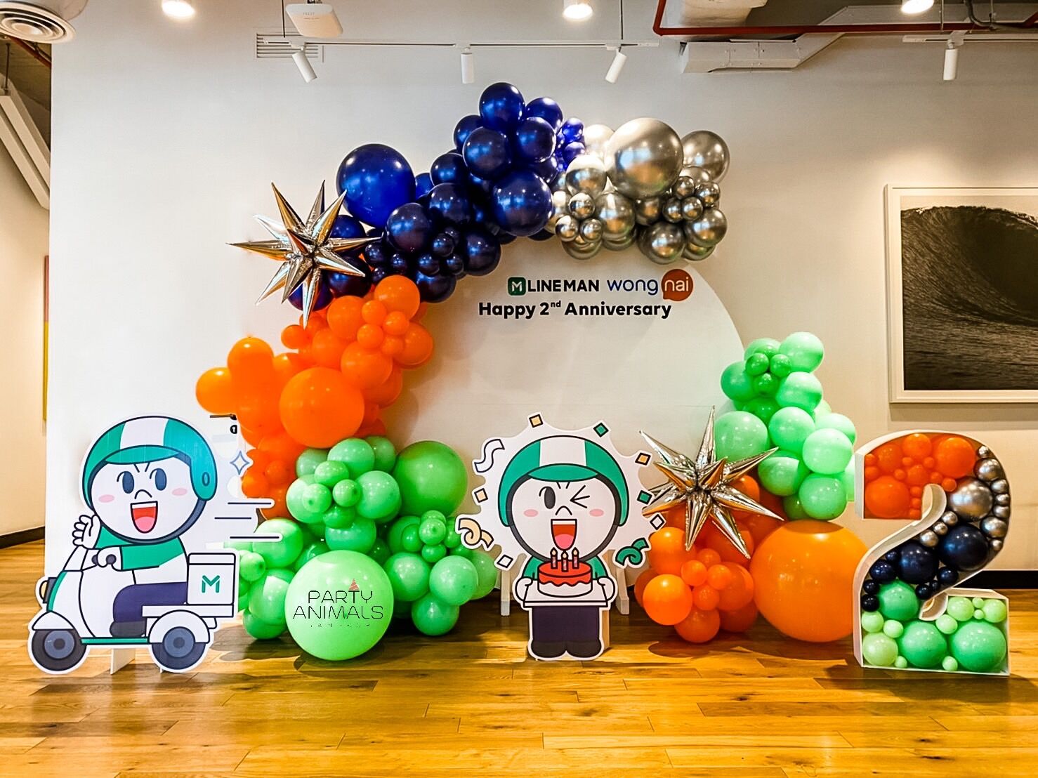 แบคดรอปลูกโป่ง ฉากลูกโป่ง Corporate Events Balloon Backdrop – Line Man Wongnai Happy 2nd Anniversary – Green & Navy
