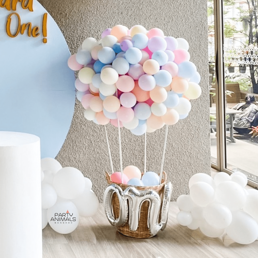 แบคดรอปลูกโป่ง ฉากลูกโป่ง First Birthday Balloon Backdrop – Sweet pastel – Pastel Rainbow & Hot Air Balloon